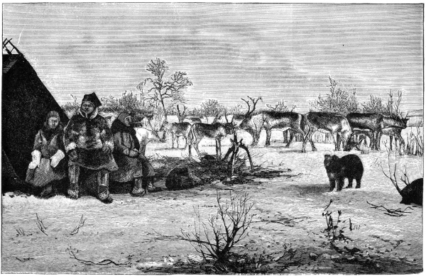 Hvor vi saa ud, da vi steg ud af Pulkene! Vi var fuldstændigt forvandlede til Snemænd. Pæsken og Huen var hvide af Sne, Øienbrynene og Øienhaarene var sammenvævede med Sne og Rimkrystaller, hele Skjægget forvandlet til en eneste, sammenhængende Isklump. Fjældlappens Bolig har ikke ret meget tilfælles med, hvad man ellers i Europa forstaar ved Navnet Bolig. Her er ikke Tale om Hus og Værelser, Tag eller Vægge. Fjældlappen bor Sommer og Vinter, i Regn og i Solskin i sit Telt. Et simpelt Stillads af Træstænger, derover et Betræk af Vadmel eller grovt Seildug, det er Fjældlappens Hus og Hjem. Teltet er kegleformet, men Grundfladen noget kantet; denne er 12-16 Fod i Gjennemsnit, Teltets Høide i Midten omtrent 8-10 Fod. Oppe i Teltets Spids er der en Aabning, som baade er Vindue, Skorsten og Ventilator. Under dette Hul findes det saa godt som altid tændte Baal, der baade varmer Maden og dem, der skal spise den eller har spist den. Paa den ene Side af Teltet findes end videre en smal Aabning, der lukkes af en af Træstænger og Vadmel dannet Dør, som er ophængt i sin øverste, spidse Ende. Dette trange Rum, hvor man næppe kan staa opreist, er Familiens Dagligstue, Soveværelse, Køkken, Spisekammer o. m. m. Af Møbler findes ikke nogen som helst Slags repræsenteret. Den med Birkeris bedækkede Grund inden for Teltet er baade Stol og Bord, baade Gulv og Seng: Om Dagen sidder man paa Skræddervis rundt om Baalet og spiser, drikker eller arbeider; om Natten placerer man sig rundt om Baalet, som det kan falde bedst. Sengklæderne er Gangklæderne. Afklædning om Aftenen eller Toilette om Morgenen er Begreber, som ikke ligger inden for Fjældlappens Synskreds. Husgeraadet indskrænker sig til nogle Gryder og Kjedler, Træskaale og Øser og et Par Skeer af Træ eller Horn, stundom Sølv. End videre nogle Træskrin til at opbevare Smaagjenstande i. Paa Stængerne, der bærer Teltet, ophænges Seletøi og Tømmer, Klæder og Kjød. I Nærheden af Teltet opsættes Stilladser af for oven sammenstødende Birkestænger; her eller i Buskene ophænges Skind, Klæder, Kjød og andet, som ikke for Øjeblikket bruges. Resten af Familiens Eiendele opbevares i de før omtalte lukkede Pulke eller i Stolpeboderne ved de fastboende Lappers Gaarde. Uden for Teltets Dør staar i Almindelighed en Slags Huggeblok, dannet af 2-3 tykke Stammer, hvor Birkevedet til hugges til Brændsel.